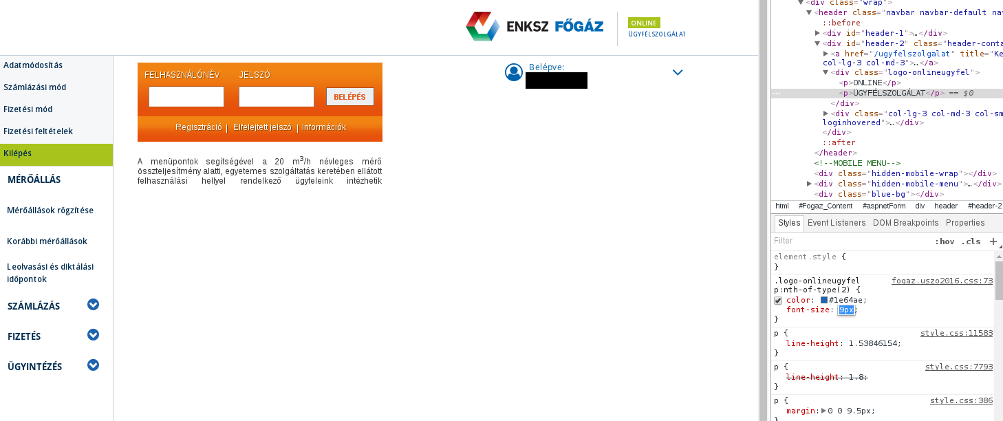 Nocsak, itt valami bibi van, mi az a narancssárga ott? Rezsicsökkentés? Nem-nem, első tippre levettem az elcsúszott Ügyfélszolgálat méretét 10px-ről 9-re, ami meg is oldotta az elcsúszás problémát (+1 tipp: Ha nem végig nagybetűvel van írva az Ügyfélszolgálat, akkor 10px-el is jó…):