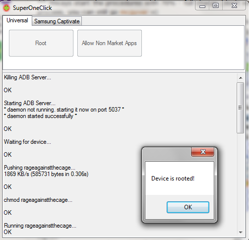 - Kattints a Root gombra! Itt várni kell egy kicsit. Amikor kész a rootolás, akkor megjelenik egy üzenet, hogy „Device is rooted!”: