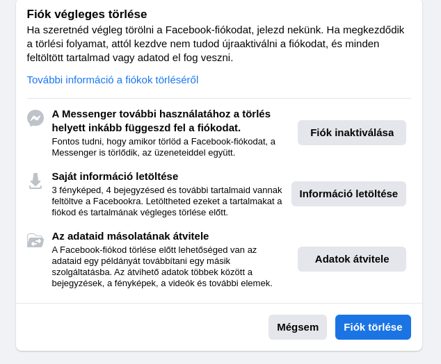 A következő oldalon még van lehetőséged letölteni a Facebook-os adataidat pl, ha nincs erre szükséged kattints az eltéveszthetetlen kék Fiók törlése gombra, aztán a jelszavad megadása után indul a folyamat.