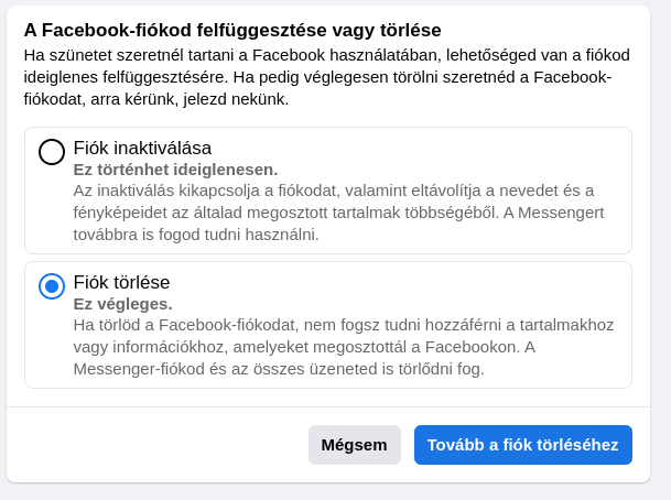 Ezen az oldalon válaszd ki a Fiók törlése opciót, majd kattints a Tovább a fiók törléséhez gombra
