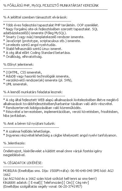Először valami olyasmire gondoltam, hogy a cég azért hirdet így, hogy ne jelentkezzen minden jött-ment az állásra, de nem így van. Segítségül hívtam a „nagytestvért” (google), és rákerestem a megadott telefonszámra. Nem kellett sokat kutatni, mert az első találatra meg is volt az, amit kerestem. Egy újabb álláshirdetős oldal, ahol jelenleg 5 álláshirdetés van (köztük a fenti is), és mindegyiknél szépen oda van írva, hogy küldjé’ óccsó sms-t, és megkapod a hirdető adatait. Kösz, de nem.